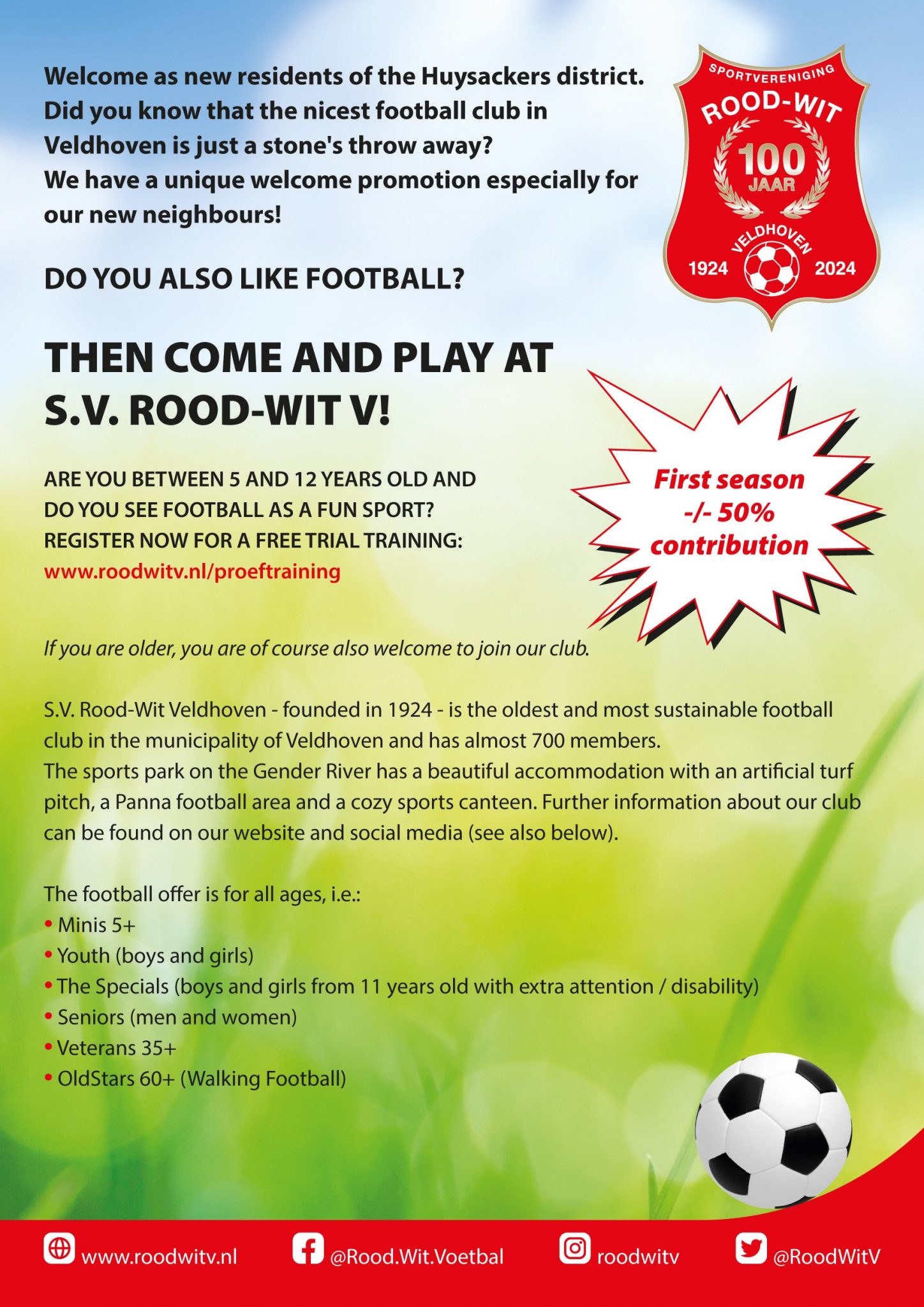 Rood-Wit wishes all (new) residents of the Huysackers district a warm welcome. Especially for the Veldhoven youth, an introduction to the oldest football club in Veldhoven, which will celebrate its centenary in 2024.