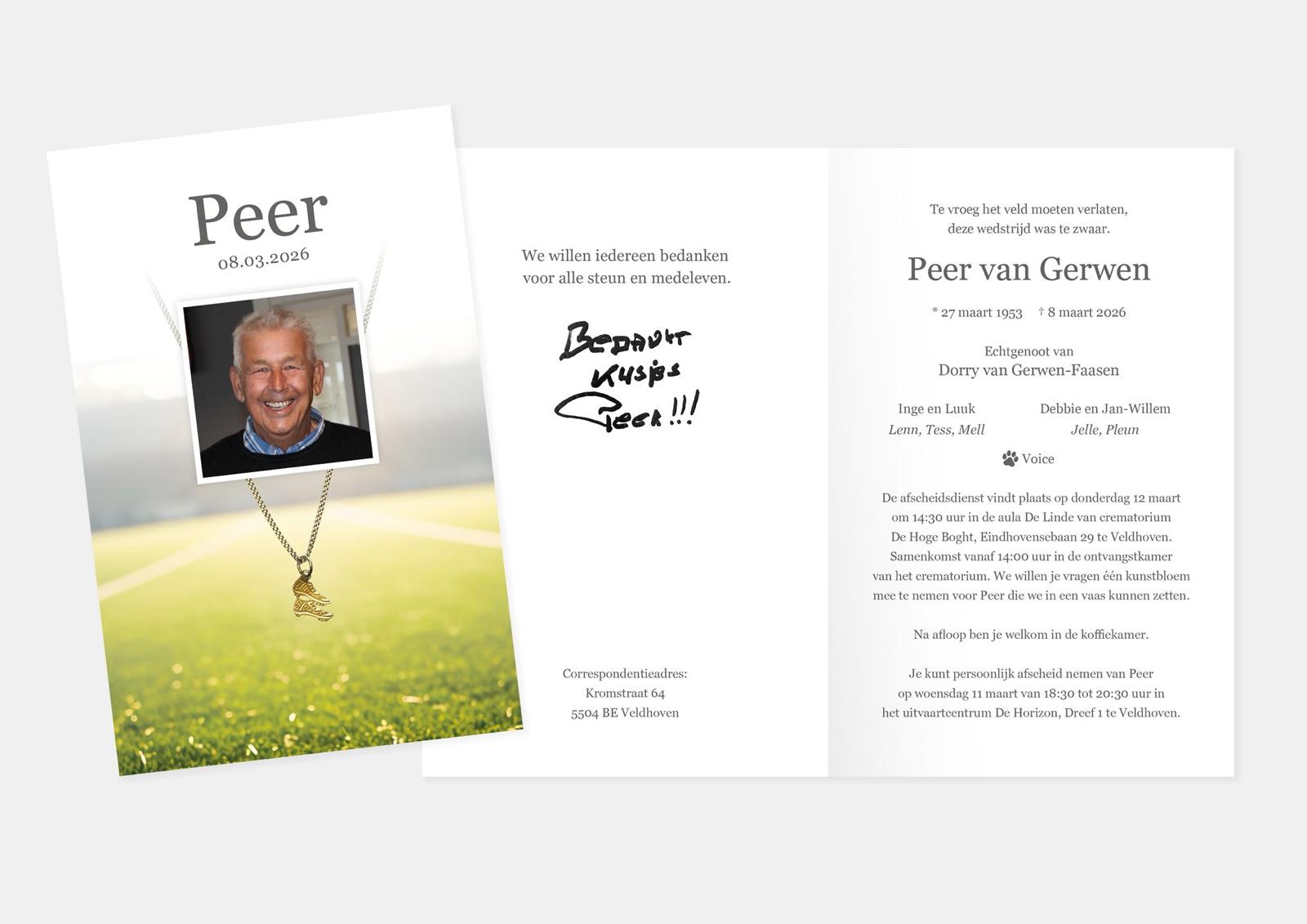 Bijgevoegd de overlijdenskaart van Peer.